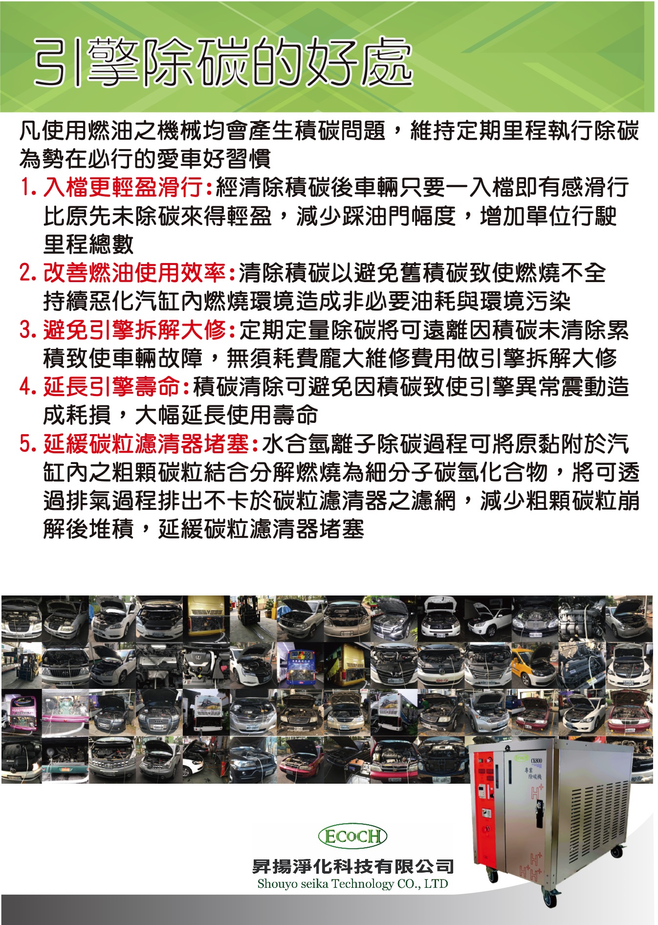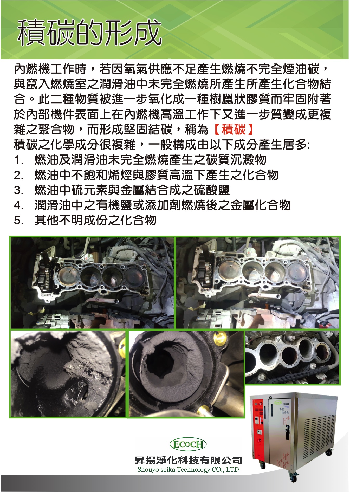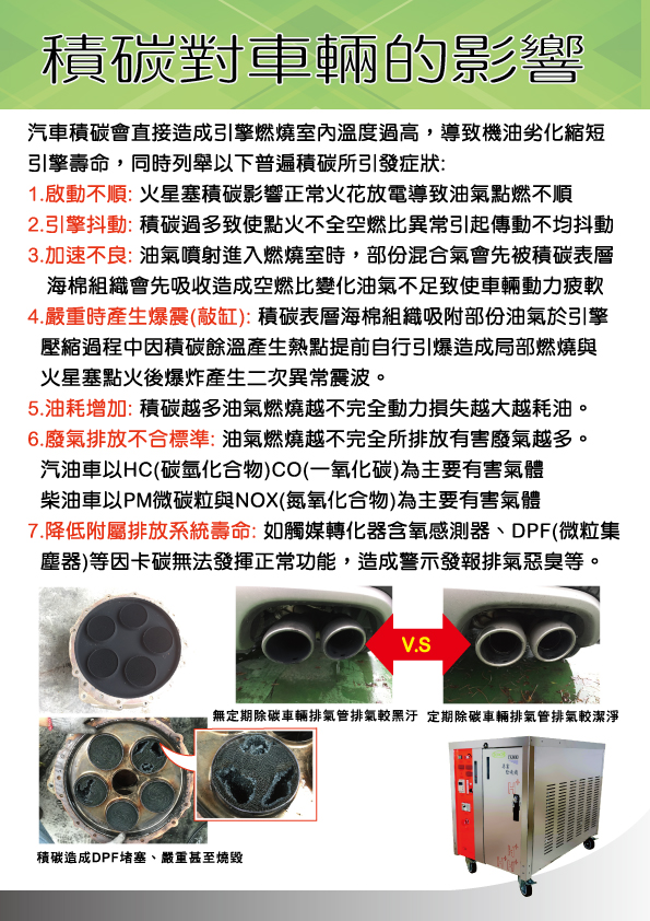 無論是大型車、小型車、汽油車、柴油車,只要之【內燃機】燃油動力機械,隨使用都會有【積碳】產生,將造成下列情形:
