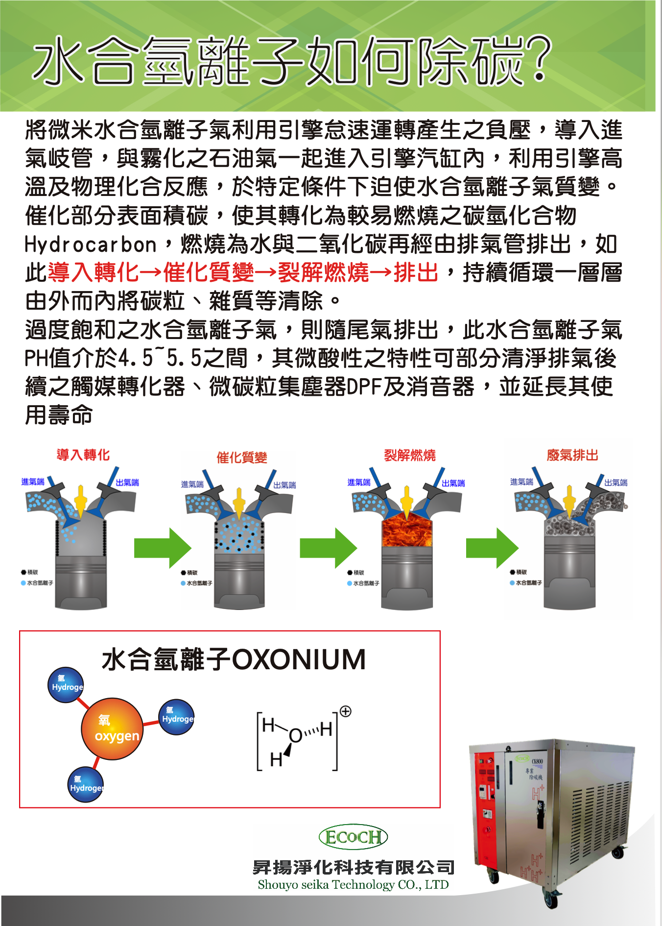 Hydrocarbon,燃燒為水與二氧化碳再經由排氣管排出,如此導入轉化→催化質變→裂解燃燒→排出,持續循環一層層由外而內將碳粒、雜質等清除。